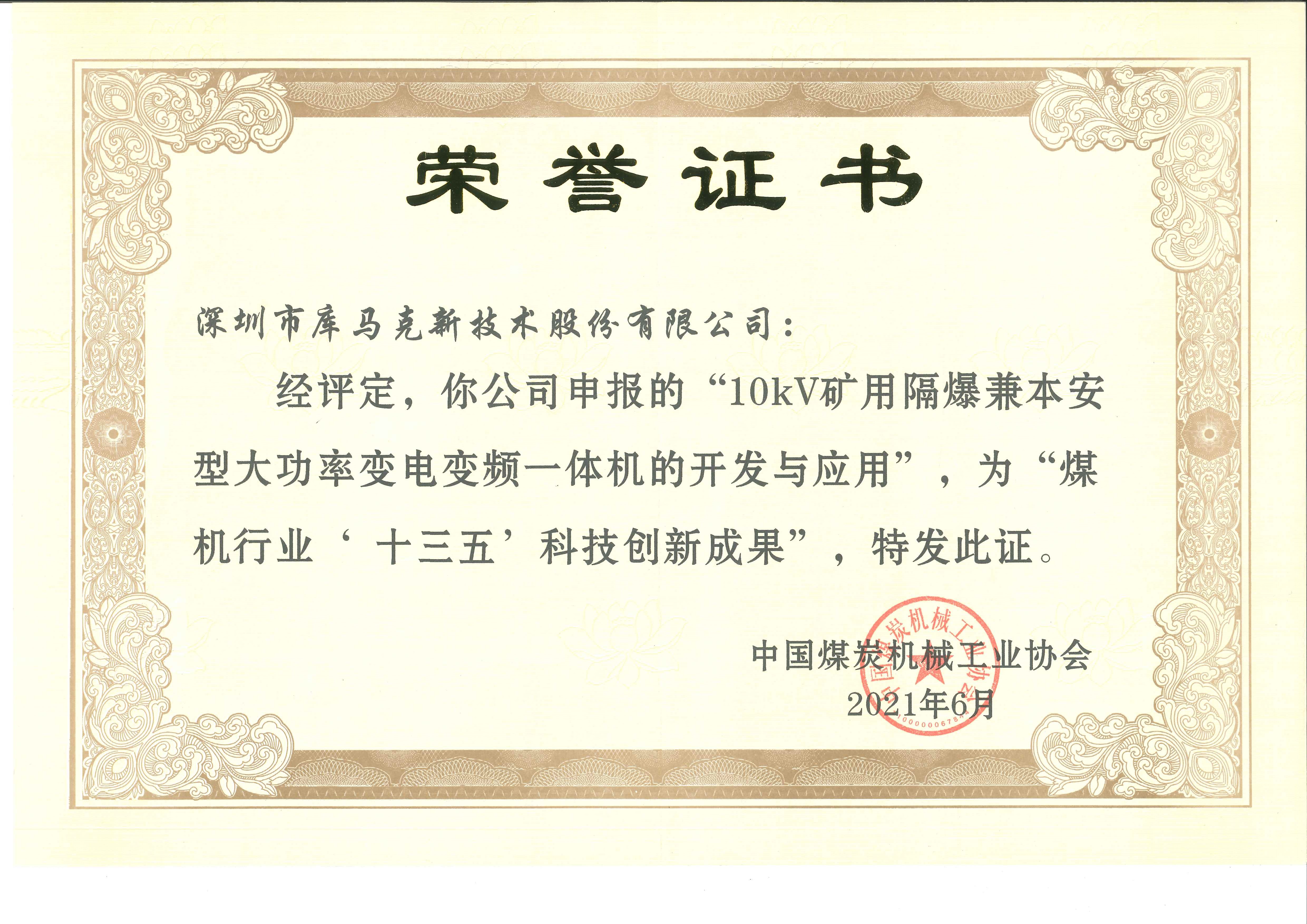 2021年6月 ,庫馬克 榮獲“10kV礦用隔爆兼本安型大功率變電變頻一體機(jī)的開發(fā)與應(yīng)用”,為“煤機(jī)行業(yè)‘十三五’科技創(chuàng)新成果”。